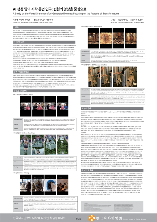 지난 2025년 11월 29일(토), 경희대학교 국제캠퍼스 예술디자인대학관에서 열린 「2025 한국디자인학회 대학생 디자인 학술발표대회」에서 우리 디자인학과 4학년 박은서, 박민하, 황수연 학생(지도교수 구자준)의 연구「AI 생성 밈의 시각 문법 연구: 변형의 양상을 중심으로」가 학술대회 논문집(Proceedings)에 포스터 논문으로 게재·전시되었다.