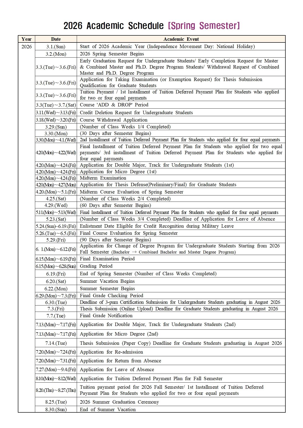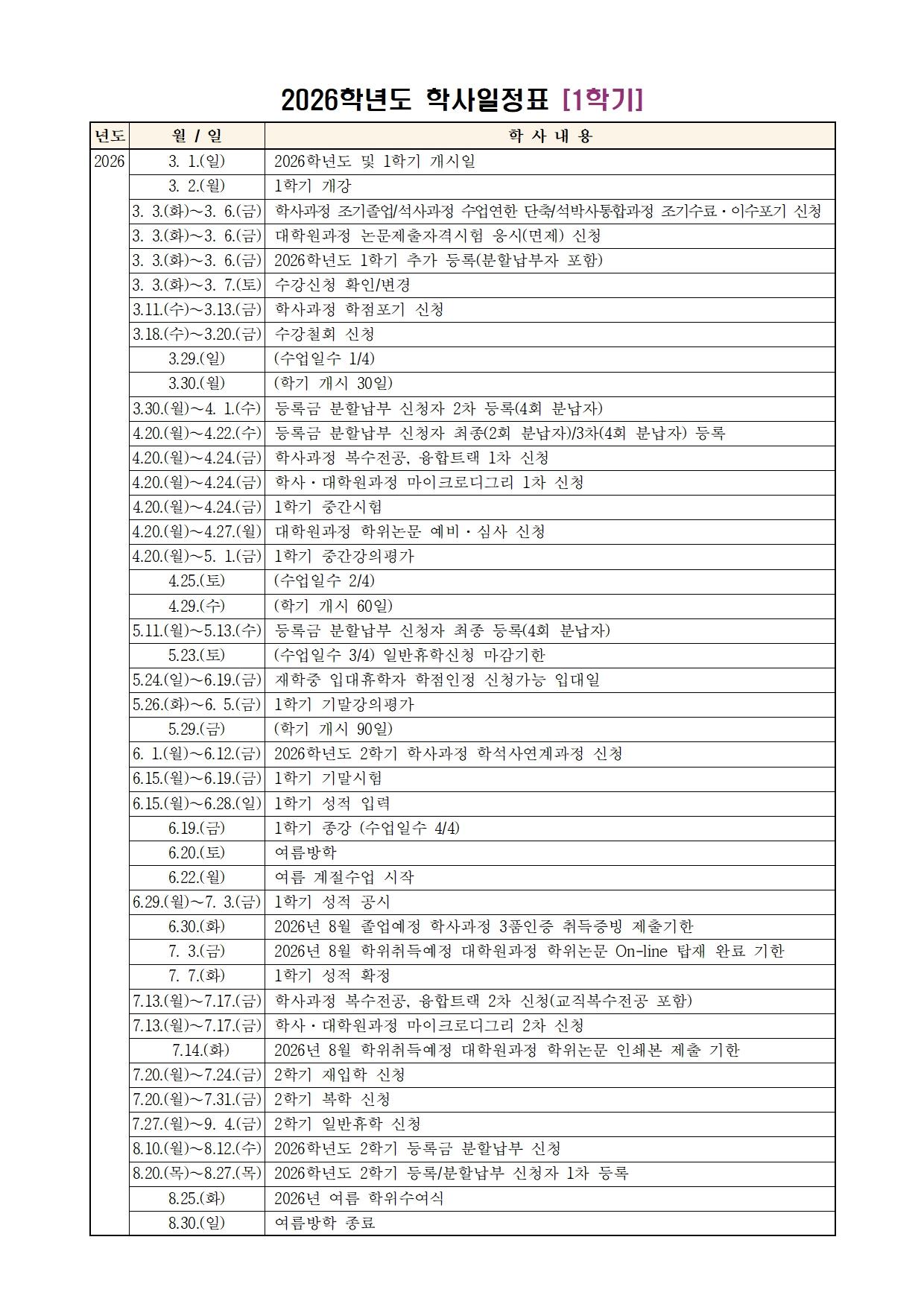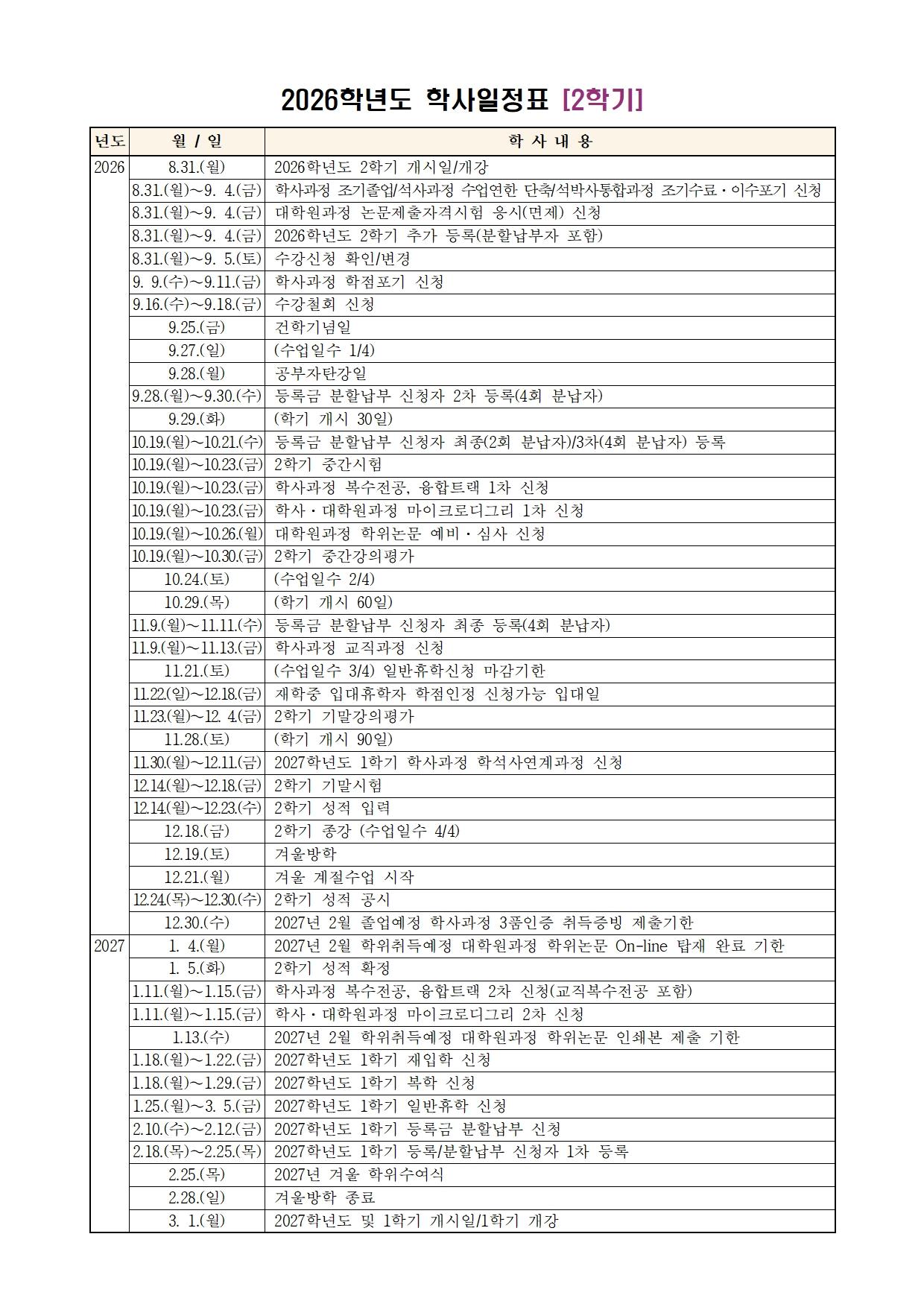 2026학년도 1학기 / Spring 2026 Academic Calendar2026학년도 2학기 / Fall 2026 Academic Calendar