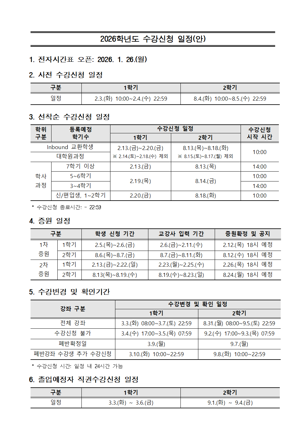 2026학년도 수강신청 일정 안내