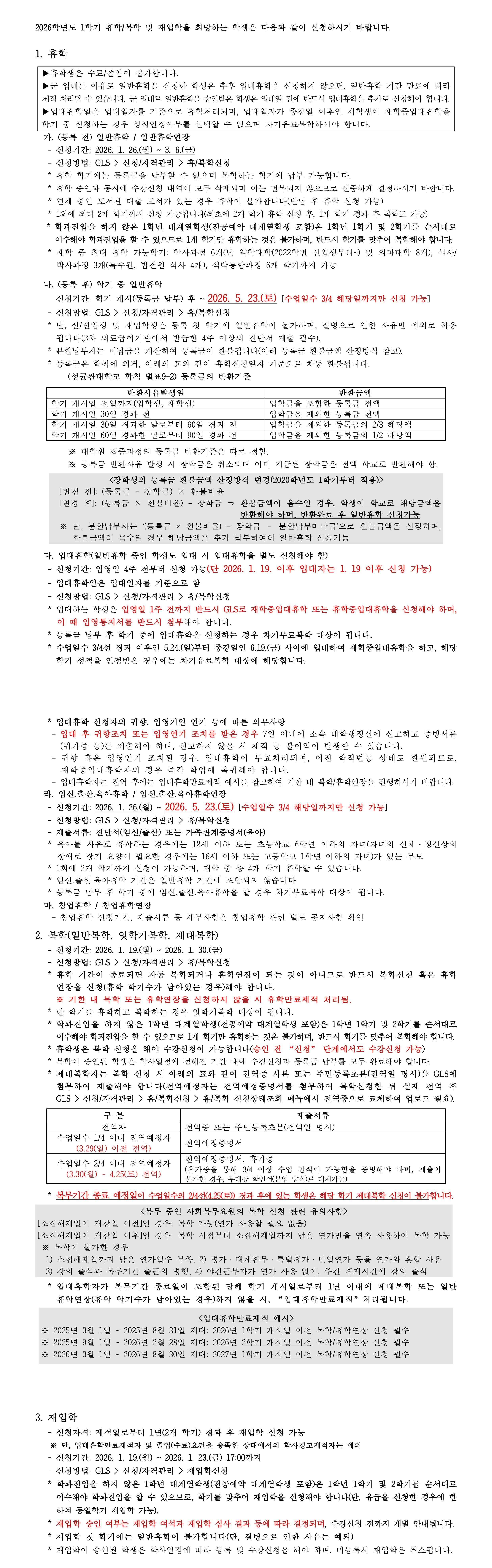 *2026-1학기 초과학기 등록 예정자는 개강 전 일반휴학 신청이 불가하며, 3.3(화)~3.6(금) 기간동안 신청해야 합니다.