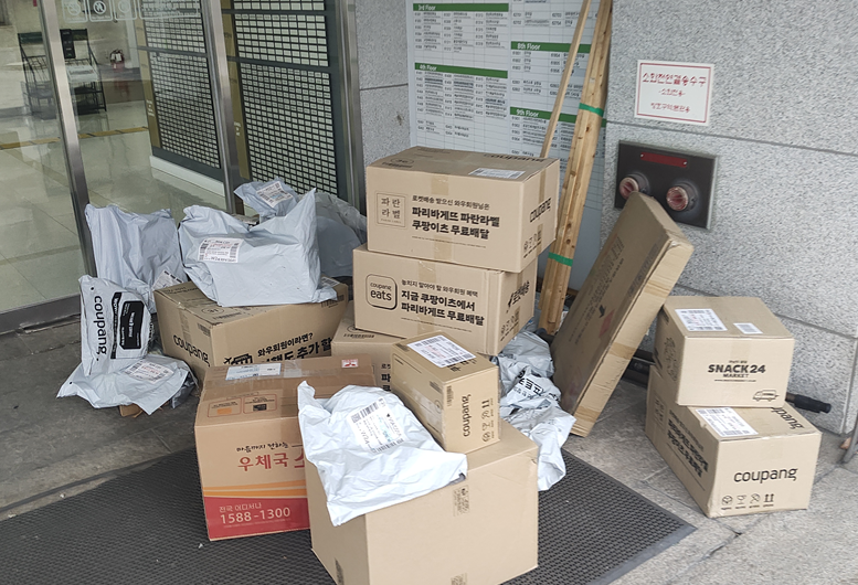 수선관 5층 입구 앞에 택배 물품이 지속적으로 적체되어 통행에 불편을 초래하고 있으며,