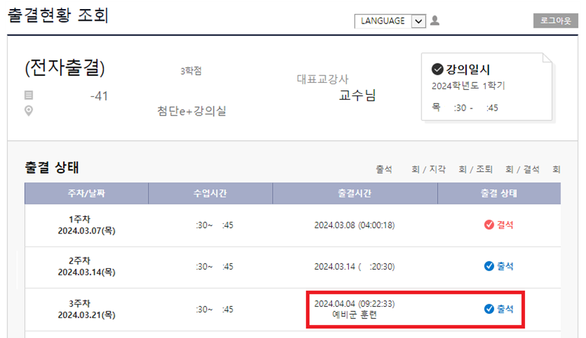 - 예비군 훈련 참석 예정인 경우, 사전에 담당 교수님께 말씀해주시기 바랍니다.